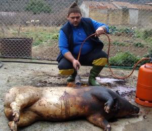 Tabloul pe care l-au găsit trupele SWAT în curtea românilor este uşor de imaginat pentru noi, scenariu de groază pentru ei: un bărbat ţinea un lighean pentru a colecta sângele, un altul pârlea porcul cu o butelie de gaz.