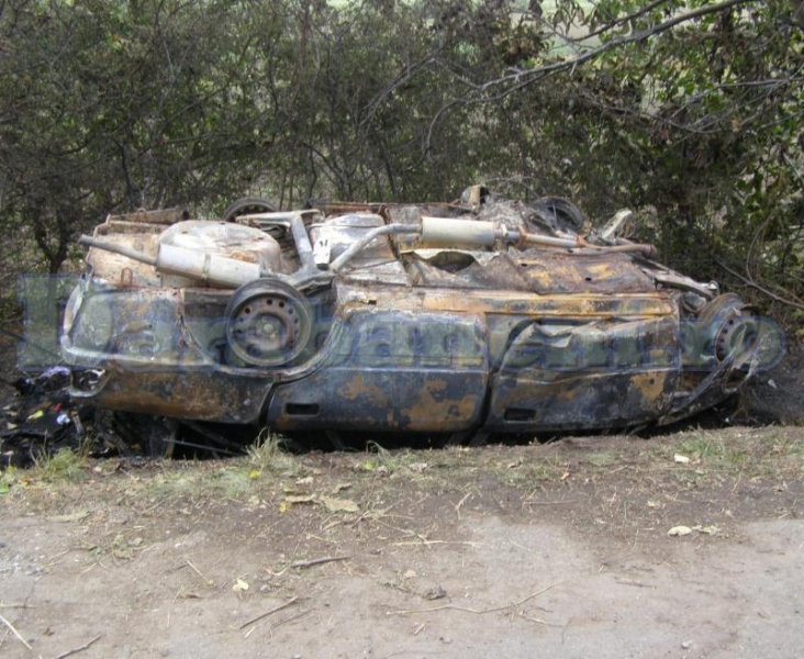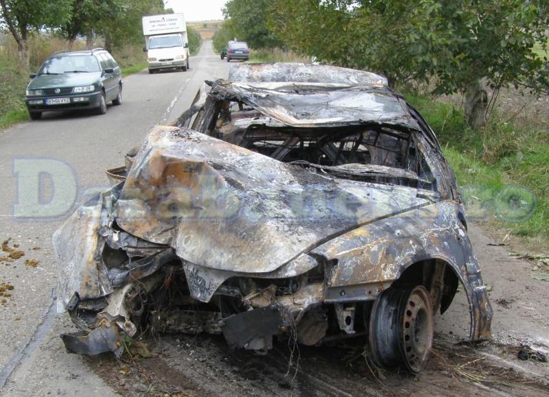 Masina transformata intr-un morman de fiare vechi dupa ce s-a rasturnat in sant si a luat foc FOTO