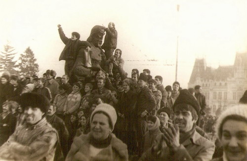 De coborât era la fel de simplu. Nu era permis să pătrunzi în vreo cameră alăturată. Urmam aceeaşi cale pe care urcasem. Odată scăpat din încătuşarea clădirii uriaşe, de sub balcon am prins grupul primilor revoluţionari ieşeni. M-am îndepărtat apoi să cuprind căt mai multe din cele ce se petreceau. Balcoanele se umpluseră de oameni. Oare era ceva care să reuşească? Eram acolo un simplu neştiutor. La fel erau majoritatea. Unii s-au oprit cu sacoşa în mână, din drumul spre piaţă. Era dorinţa oamenilor de a scăpa de Ceauşescu, sau era o revoltă împotriva comunismului ? Poate, dacă aş fi fost membru de partid, aş fi fost în temă cu ceva.