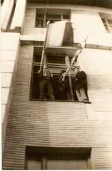 Cu aparatul în buzunar, am ajuns la timp la uşa care tocmai o forţaseră oamenii. Nu era coadă la intrare aşa că m-am strecurat şi eu. În locul unui bilet de acces, acolo era o persoană care rupea fâşii dintr-un cearşaf şi ţi le lega la mâna stângă. Urcam repede scările, coordonaţi de alte persoane, spre un punct numai bun scopului urmărit de mine: balconul. Odată ajuns, încă nu se aglomerase, am scos aparatul de fotografiat şi cu teamă am făcut repede două clişee mulţimii adunate în stradă. Aveam o stare ciudată: exaltare şi teamă. Nu cunoşteam pe nimeni din cei care conduceau acţiunea. Dacă apar iar perechile de miliţieni şi soldaţi? Unde vei dormi la noapte? Nu puteam fotografia aşa de aproape.