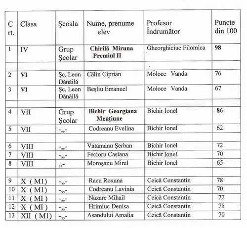 PS: Din tabelul de mai sus lipsesc Murariu Raluca(93 pct.), Andruş Andreea(78 pct.) şi Lupu Diana(77 pct.), elevele prof. Vanda Moloce de la Şcoala "Leon Dănăilă". Ne cerem scuze pentru eroarea comisă.