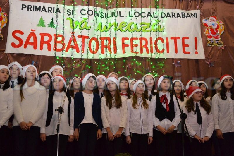 Spectacolul din Sala Casei de Cultură „Theodor Balş” a început cu mare întârziere, pentru care primarul şi-a cerut scuze, fiind prezentat de către elevii Smărăndiţa David şi Alexandru Beţianu. Dacă la orele 10:00, prin sală bătea vântul, două ore mai târziu nu aveai unde să arunci un ac. Cadrele didactice s-au străduit cât au putut, iar rezultatele discipolilor lor nu au întârziat să apară. Preşcolarii Grădiniţei nr. 2, coordonaţi de educatoarea Doiniţa Cute, i-au întâmpinat pe dărăbăneni cu pluguşorul şi un recital de colinde plus dansuri populare.