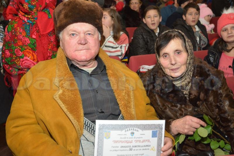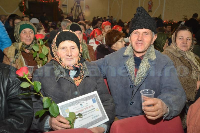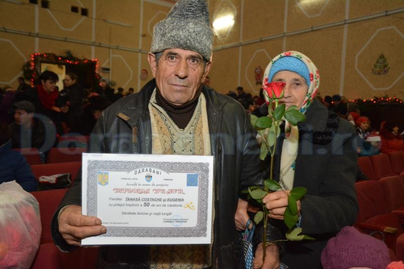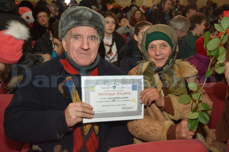 Poate că nu era cel mai potrivit moment ca şeful Poliţiei din Darabani să ne prezinte la Sărbători, numărul de violuri, al uciderilor din culpă, tâlhăriilor sau relelor tratamente acordate minorilor, dar până la urmă aceasta este cruda realitate. Comisarul şef Marius Gavrilescu a prezentat un raport mai scurt, motivând că aria de competenţă a instituţiei pe care o conduce este mai mică. Primarul Corneliu Aroşoaie, cu ajutorul a două crăciuniţe, a premiat cele 23 de familii de seniori dărăbăneni care au împlinit 50 de ani de la căsătorie. Bătrânii, în marea lor majoritate persoane nevoiaşe, au primit câte o diplomă, un trandafir roşu şi 100 de lei într-un plic. În final, ei au ciocnit un pahar de şampanie cu primarul oraşului. Aleşii şi funcţionarii dărăbăneni au eliberat scena pentru a face loc urătorilor. (foto şi video: Cristian RĂCNEA)
