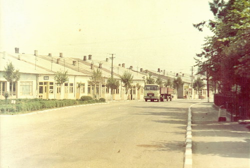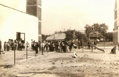 După o jumătate de deceniu îl întâlnesc din nou pe Mitică. Nu se schimbase mai deloc. Mesteca şi acum gumă şi era foarte supărat pentru că i se furase bicicleta din faţa liceului. Mă salută şi mă invită la o plimbare cu şareta(foto stânga) prin târg. Trecem pe lângă şirul de clădiri încolonate, lăsate amintire de evreii plecaţi, după care lăsăm în urmă Casa de Cultură, vestită pentru partidele de remi şi planşele şi afişele domnului Horju. Ne stingem apoi setea cu apa fermecată a fântânii din flori. Ne odihnim câteva momente pe banca din faţa primăriei. Mitică scoate din buzunar o pereche de cărţi. După ce am plecat în gazdă pe calul lui Chirilă, mă trezesc, la un moment dat, cu actele de proprietate a trei locuinţe. Schimb datorită bunăvoinţei suspuşilor, apartament pe apartament, înapoiez o garsonieră şi fac cadou un apartament, în final. Trecem apoi cu caleaşca timpului pe lângă blocurile în a căror apartamente nu se prea înghesuiau foarte mulţi, lăsând în urmă jucăria cea nouă, unde copiii(foto jos) învaţă să stea la coadă. Ajungem în faţa clădirii care reprezenta mândria tehnicii din oraşul Darabani: Filatura.